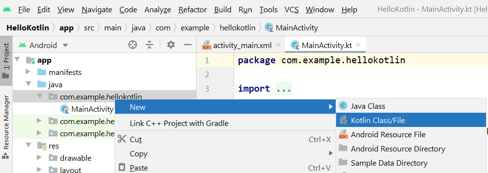 1. Right-click the application name in the java package (com.example.hellokotlin) > New > Kotlin Class/File.