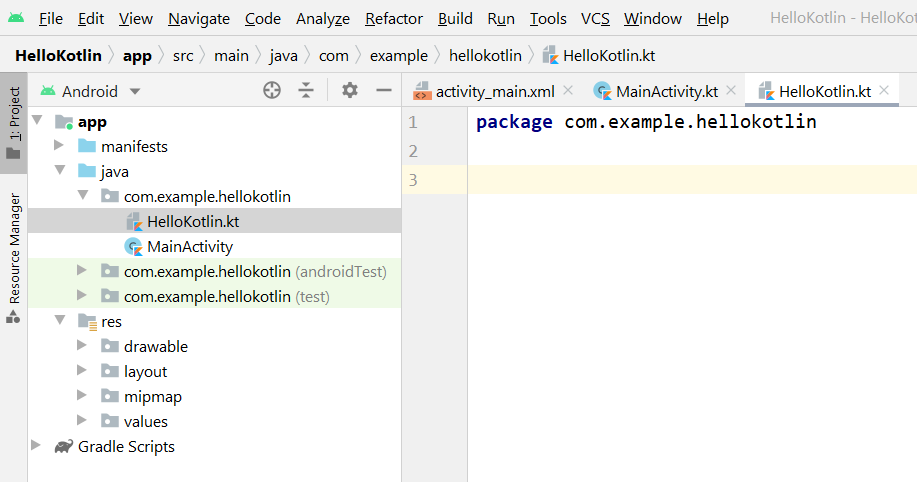 4. You will see a new file added to package com.example.hellokotlin as illustrated below.
