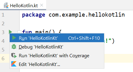 6. To run the program, click on the Run button on the line number bar and then select “Run ‘HelloKotlinKt”.