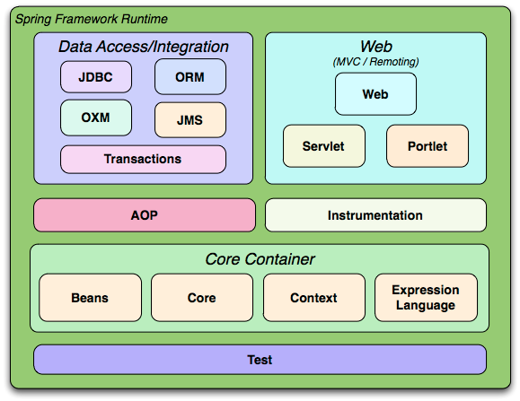 The Spring Framework contains a lot of features, which are well-organized in about twenty modules. These modules can be grouped together based on their primary features into Core Container, Data Access/Integration, Web, AOP (Aspect Oriented Programming), Instrumentation and Test. These groups are shown in the diagram below.