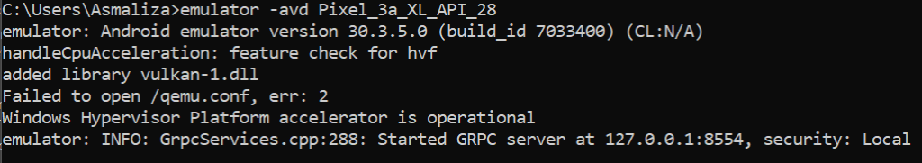 - Add path to your android emulator to the PATH environment variable eg. C:\Users\Asmaliza\AppData\Local\Android\Sdk\emulator