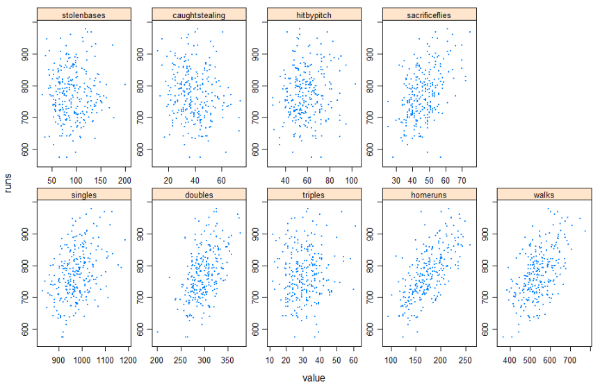 Based on the plot, we can see that as predicted, teams that hit a lot of homeruns definitely score more runs. Eventually, teams that walks also able to score more runs as well. Interesting.