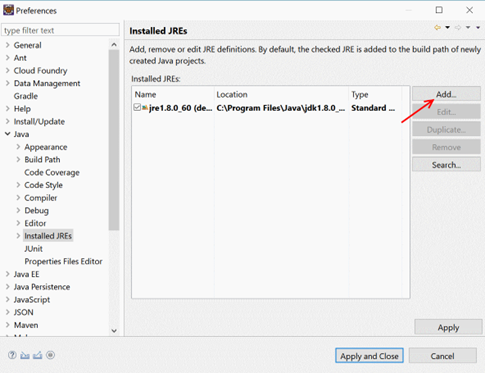 - From the top bar, select Window -> Preferences -> Java -> Installed JREs, then click on Add…